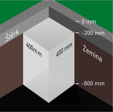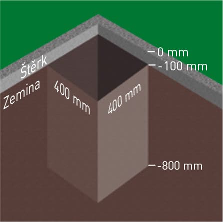 Vykopejte všechny základové díry (400 x 400 x 800 mm).