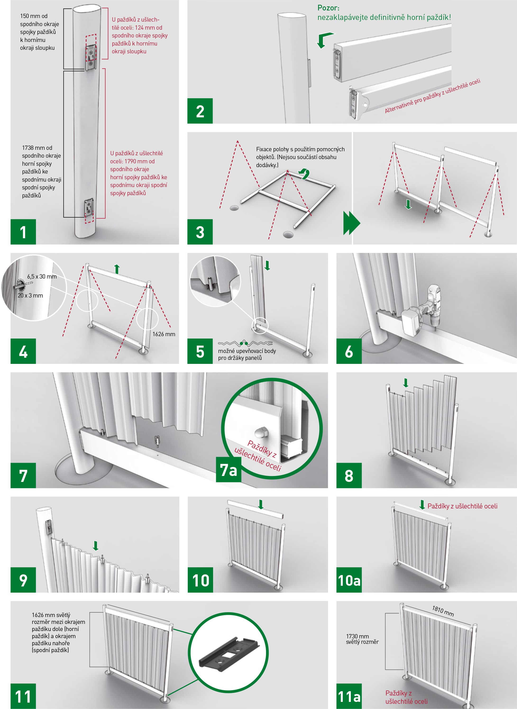 Zasunutím spojte panely vždy s předchozím panelem. (Pozor: u paždíků z ušlechtilé oceli se používají panely se speciální délkou 180,5 cm.) Nasaďte horní paždík z ušlechtilé oceli a definitivně zaklapněte. Upevněte první a poslední panel pomocí závitového kolíku a uzavřené matice na spodním a horním paždíku (otvory v paždíku jsou již předvrtané).