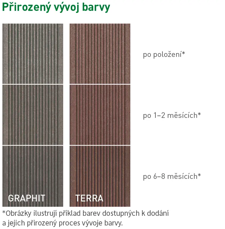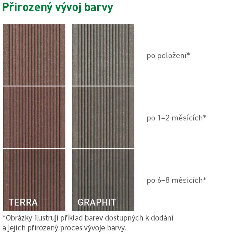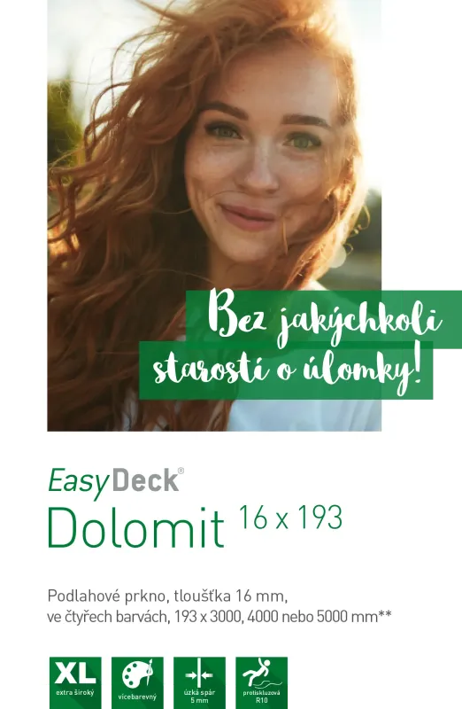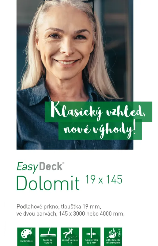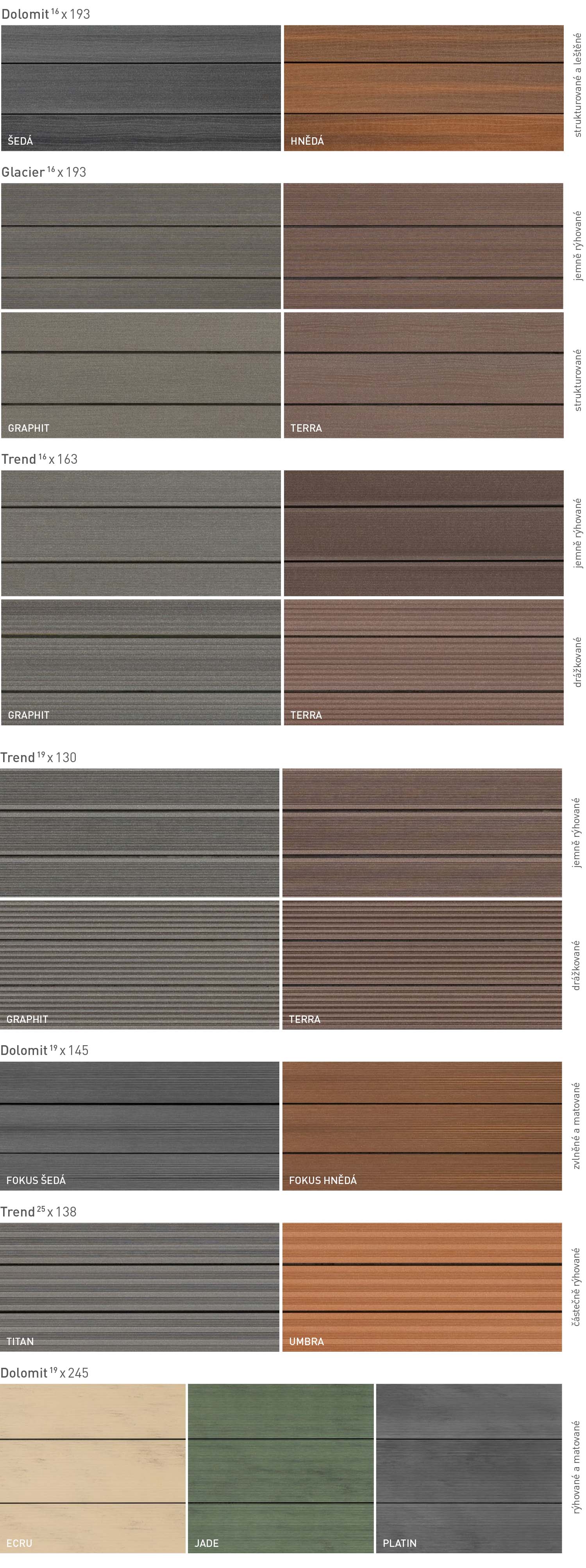 Dolomit 19 x 145: Klasická, prémiová a robustní. Prkna s vlnitým, matným povrchem jsou k dispozici v barvách Fokus hnědá nebo Fokus šedá. Použitý materiál GCC HARZart zpevňuje povrch prken. Je utěsněný, snadno se udržuje a je nehořlavý. Struktura a přirozený barevný přechod promění vaši terasu v příjemnou oázu plnou pohodlí.