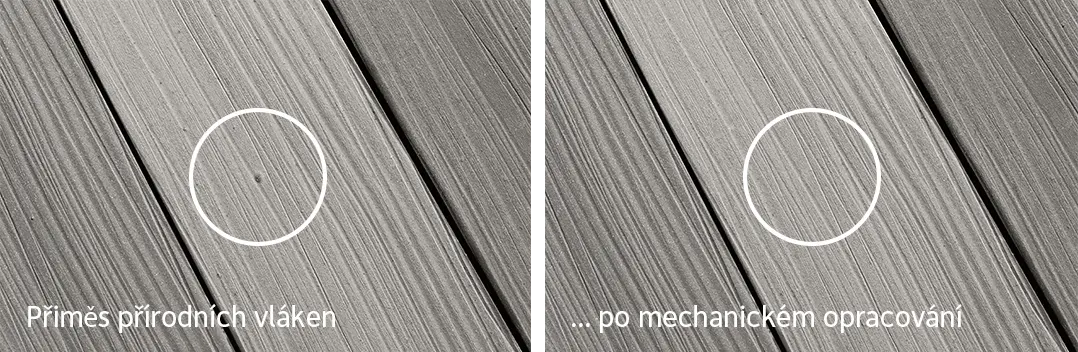 Mnoho skvrn časem zmizí vlivem slunce a deště. Na odolnější skvrny na prknech z GCC HOLZart a GCC HARZart doporučujeme použít náš speciální vysoce koncentrovaný tekutý čisticí prostředek GCC Pure Wash. Čisticí prostředek bez fosfátů je vyroben z obnovitelných surovin a je plně biologicky rozložitelný.