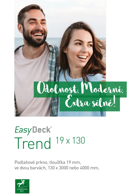 S tloušťkou 19 mm je naše deska Trend 19x130 opravdu odolná. Deska má dvě různé strany. Jedna strana se pyšní jemným vlnitým designem a druhá strana je rýhovaná. Obě strany lze pokládat v barvě terra nebo graphite. Instalací těchto desek namísto barevně stálých a protiskluzových desek můžete moderním a bezpečným způsobem vylepšit svůj venkovní volný čas.