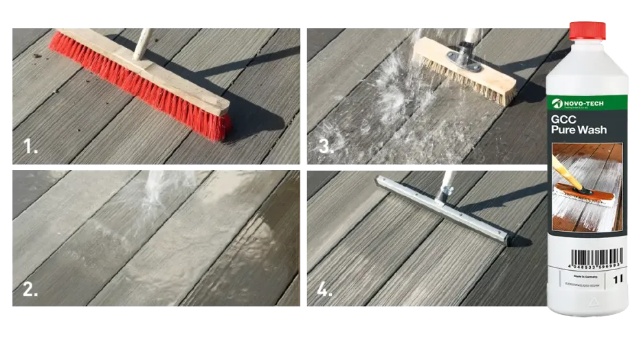 K tomu rovnoměrně rozetřete prášek na terasu, která byla předem očištěna a navlhčena přípravkem GCC Pure Wash. Vpracujte a odstraňte čistou vodou a kartáčem GCC od EasyDeck® (korundový kartáč). Poté důkladně opláchněte vodou a stáhněte stěrkou. V případě potřeby aplikaci opakujte. Neošetřujte citlivé povrchy ani je předem nezakrývejte.