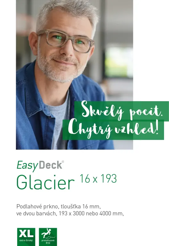 Desky z řady Glacier se vyznačují kombinací dvou různých stran. Desky Glacier 16x193 lze pokládat z obou stran a na jedné straně mají jemně zvlněný povrch, na druhé straně povrch s charakterem dřeva. Náhodně rozmístěné struktury povrchu dodávají povrchu vizuální dynamiku. Extra široké terasové desky jsou k dispozici v barvách terra a grafit a jsou skutečným magnetem pro oči!