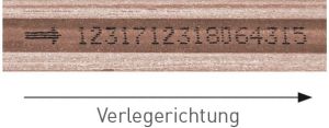 Um eine homogene Oberflächenwirkung zu erzielen, verlegen Sie alle Dielen in derselben Verlegerichtung. Diese wird durch einen Pfeil in der Dielennut bzw. durch ein Etikett auf der Diele gekennzeichnet. Mischen Sie die Dielen vor dem Verlegen. So können die geringen Farbunterschiede der Dielen die natürliche Optik unterstreichen.