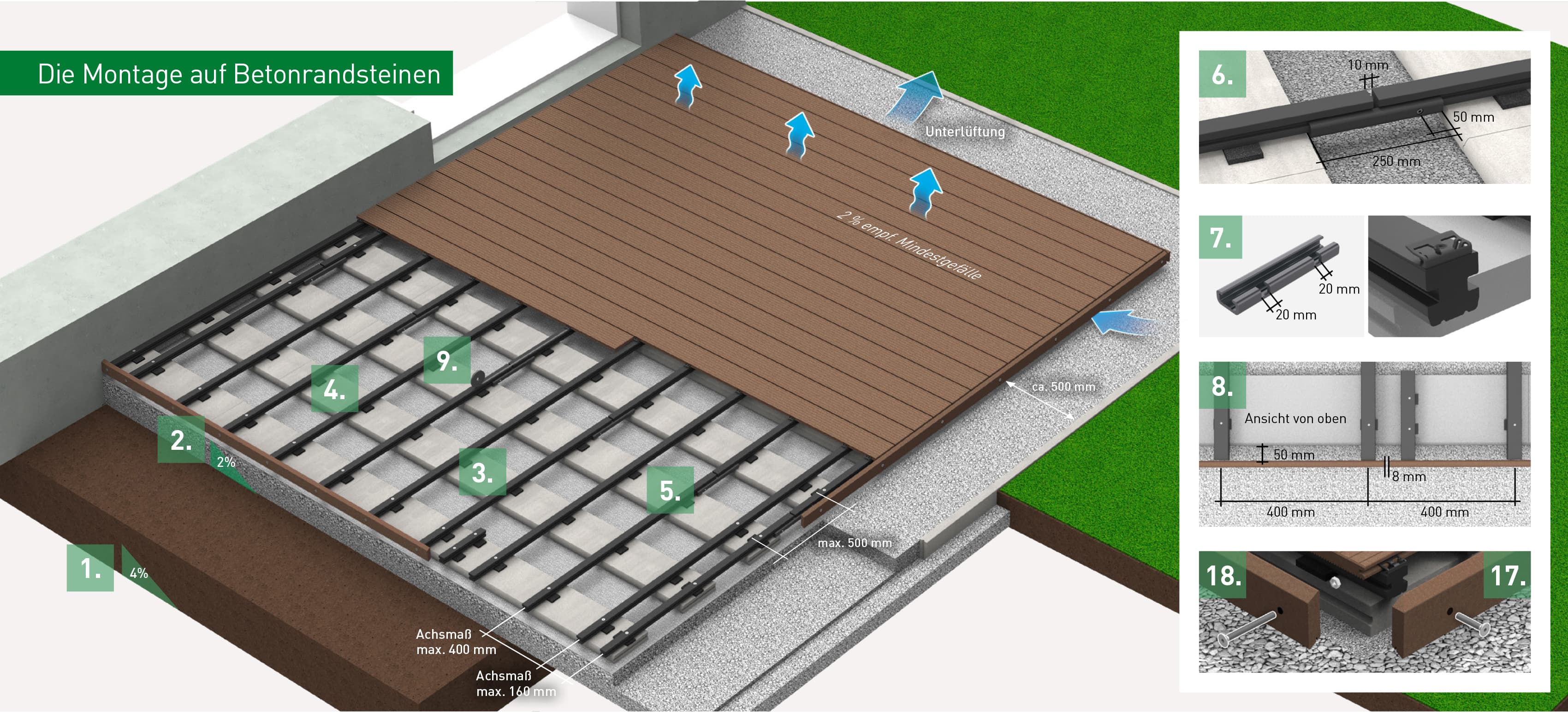 - Maximaler Dielenüberstand über der letzten Unterkonstruktion: 50 mm