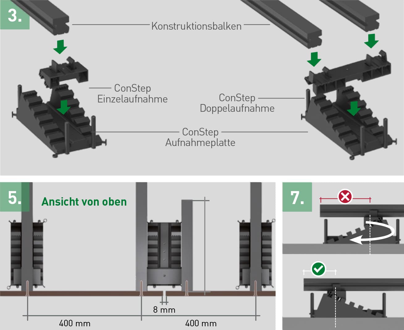 ConStep Platte mit Doppelaufnahme mit 80 mm Abstand zur Hauswand und maximal 500 mm in Flucht zur nächsten ConStep Platte mit Doppelaufnahme platzieren.