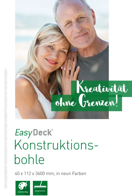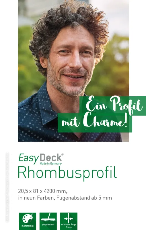 Das neue EasyDeck® Konstruktionsholzprogramm ist für Ideen jeder Art gemacht und besticht durch großartige Flexibilität. Mit dem enthaltenen Rhombusprofil und der Konstruktionsbohle lassen sich zahlreiche Gestaltungen für den Außenbereich umsetzen.