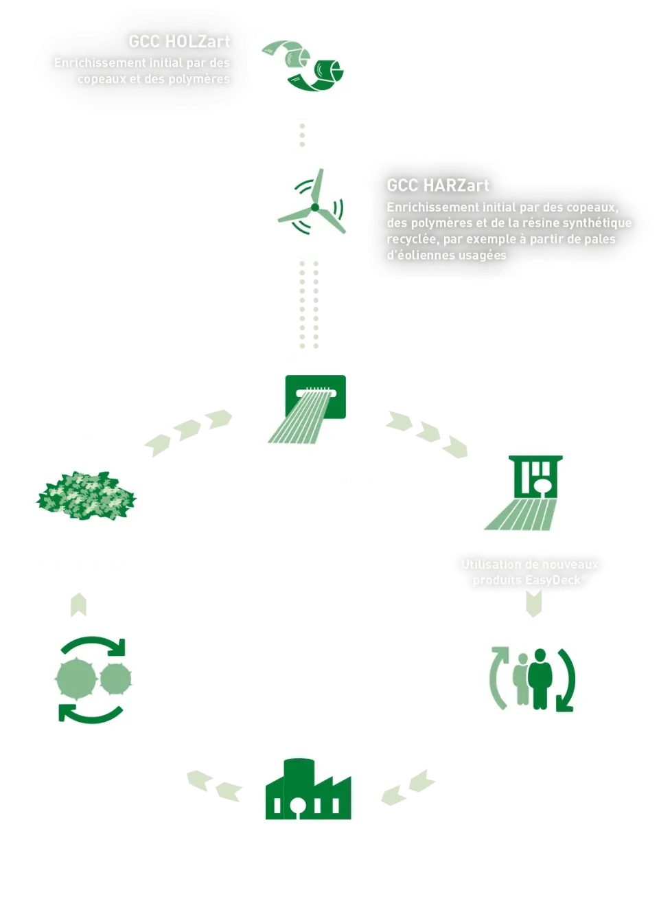 Si quelque chose est ancré dans nos gènes, c‘est bien le principe Cradle to Cradle®. Il décrit des cycles de matériaux dans lequel les produits ou les matières premières circulent dans des cycles récurrents – il n’y a pas de déchets. Afin d’assurer une mise en œuvre cohérente de cette gestion en circuit fermé, nous exploitons des systèmes spéciaux pour le recyclage de nos produits en bois GCC fabriqués depuis 2005. Cela nous permet de préserver et d’utiliser les ressources existantes sans perte de qualité, et nous pouvons, sans la consommation supplémentaire de matières premières naturelles, nous développer et fabriquer des produits de construction répondant aux normes de qualité les plus élevées.