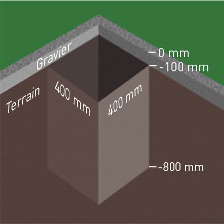 Creuser tous les trous des fondations où viendront se loger les poteaux (400 x 400 x 800 mm).