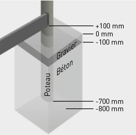 Remplir les premiers 100 mm du trou de fondation avec du béton coulé. Placer le cadre à une profondeur de -700 mm dans le trou de fondation. Caler le bord inférieur du poteau avec exactitude à l’aide d’une petite brique de construction. Remplir le trou de fondation jusqu’à -100 mm avec du béton coulé. Tous les poteaux doivent être parfaitement verticaux.