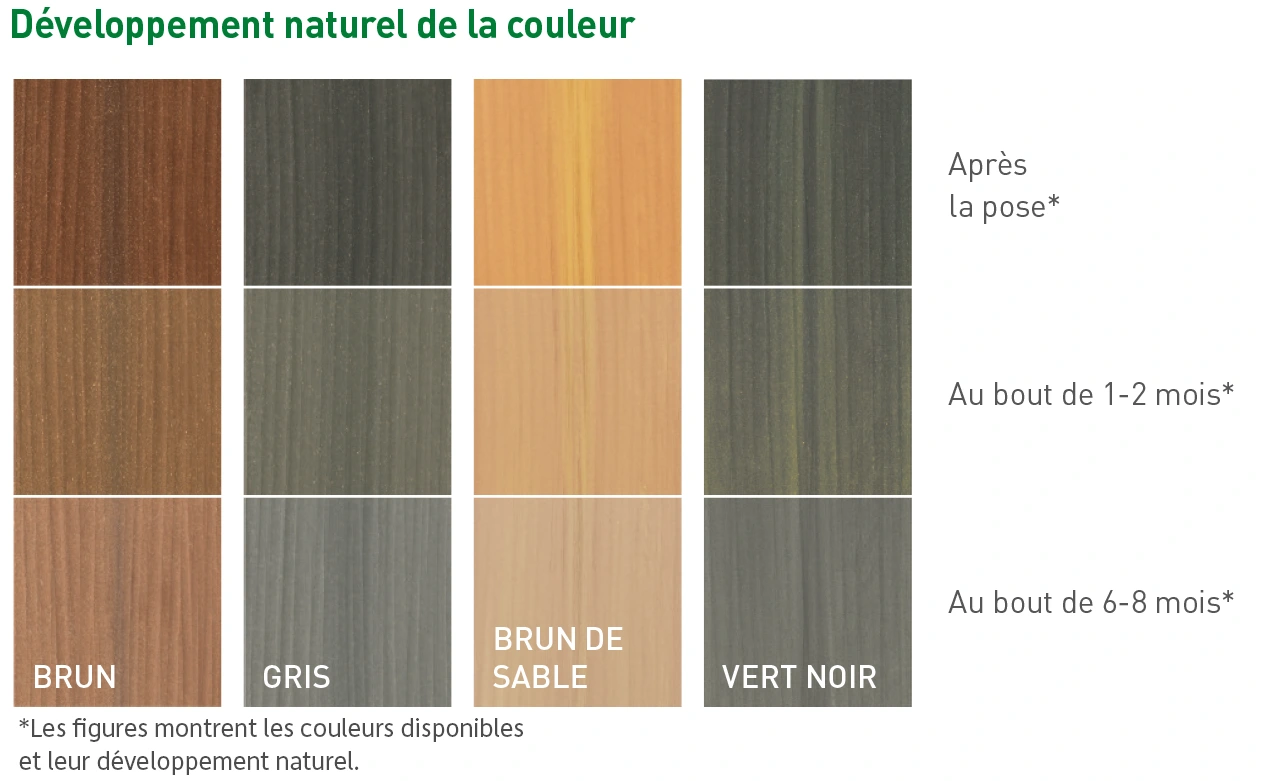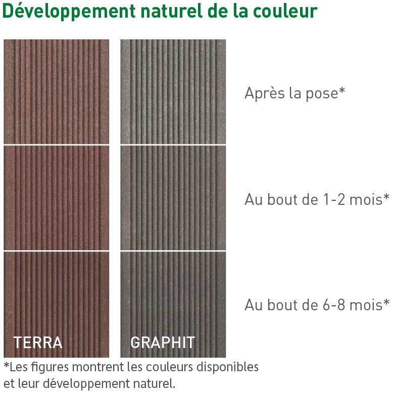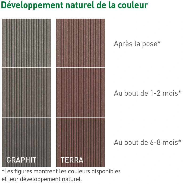 Les lames EasyDeck®, tout comme la nature, ne cesseront de vous plaire et de vous surprendre. Leurs couleurs chaudes et douces créent une sensation de bien-être unique, tandis que leurs structures variées apportent de la vie et des détails authentiques à votre terrasse. Solide et résistant aux conditions extérieures, ce matériau naturel et durable dérivé du bois agrémente durablement votre espace extérieur – avant de retrouver un nouveau cycle de vie lors de sa réintégration dans le processus de production.