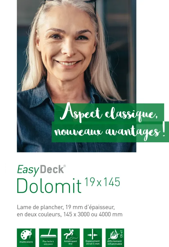 Classique, de qualité et robuste - la lame Dolomit 19x145. La lame avec sa surface ondulée et mate peut être choisie en couleur Fokus Brun ou Fokus Gris. Le matériau GCC HARZart utilisé renforce la surface de la lame. Elle est étanche, plus facile à entretenir et difficilement inflammable. La texture et le dégradé de couleur naturel transformeront votre terrasse en une oasis confortable.