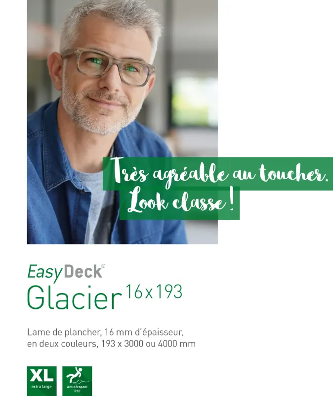 Les lames de la série Glacier se caractérisent par l’association de deux faces différentes. La lame Glacier 16 x 193 peut être posée des deux côtés – d’un côté sa surface présente des stries fines alors que l’autre côté est réalisé avec un effet bois brossé. Des textures aléatoires et fluides de bois brossé confèrent à la surface de la lame un agréable dynamisme optique. Les lames de plancher extra larges sont disponibles dans les couleurs Terra et Graphit et leur aspect est très tendance !