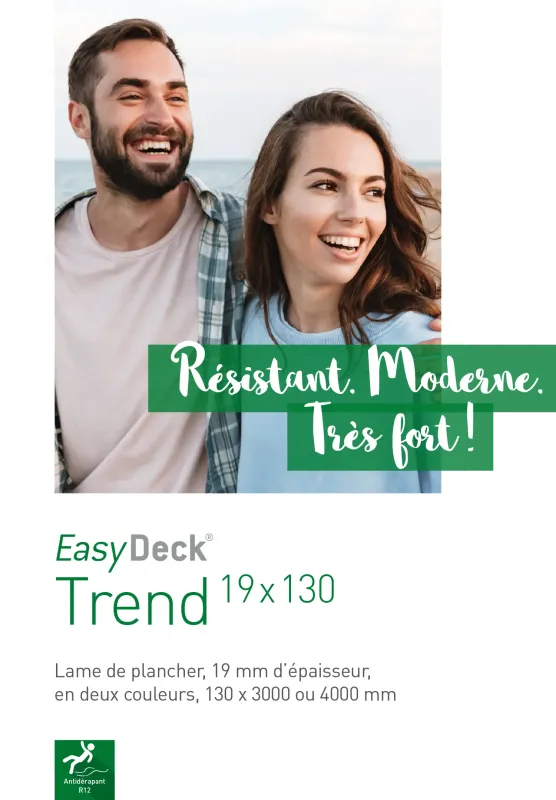 Avec ses 19 mm d’épaisseur, notre lame Trend 19x130 est vraiment forte. La lame a deux faces différentes. Une surface présente de fines stries et l’autre est rainurée. Les deux faces sont disponibles à la pose en couleur Terra ou Graphite. Les lames antidérapantes et dont la couleur reste stable dans le temps vous permettent de moderniser et d’améliorer la sécurité de votre espace extérieur !