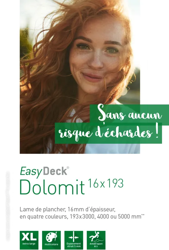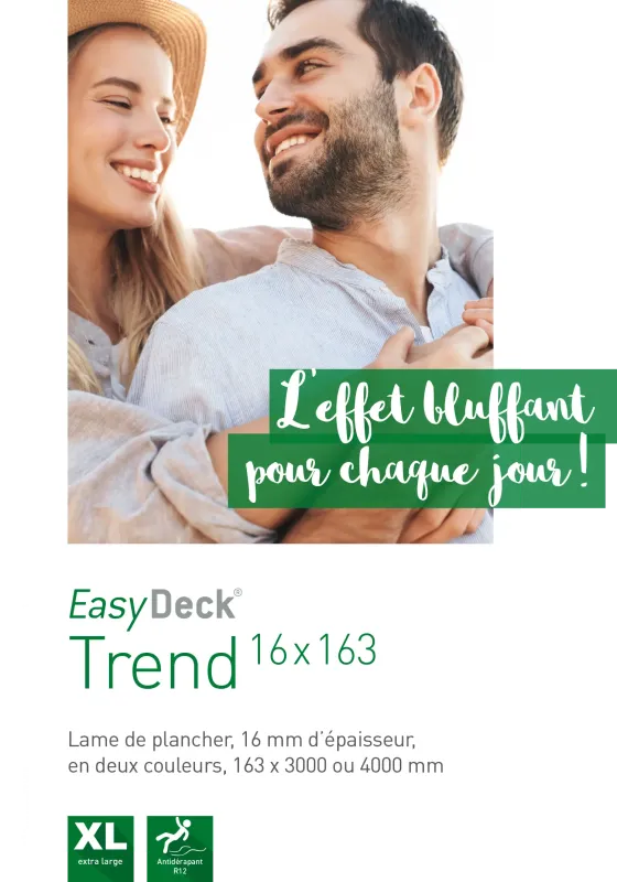 Les lames EasyDeck®, tout comme la nature, ne cesseront de vous plaire et de vous surprendre. Leurs couleurs chaudes et douces créent une sensation de bien-être unique, tandis que leurs structures variées apportent de la vie et des détails authentiques à votre terrasse. Solide et résistant aux conditions extérieures, ce matériau naturel et durable dérivé du bois agrémente durablement votre espace extérieur – avant de retrouver un nouveau cycle de vie lors de sa réintégration dans le processus de production.