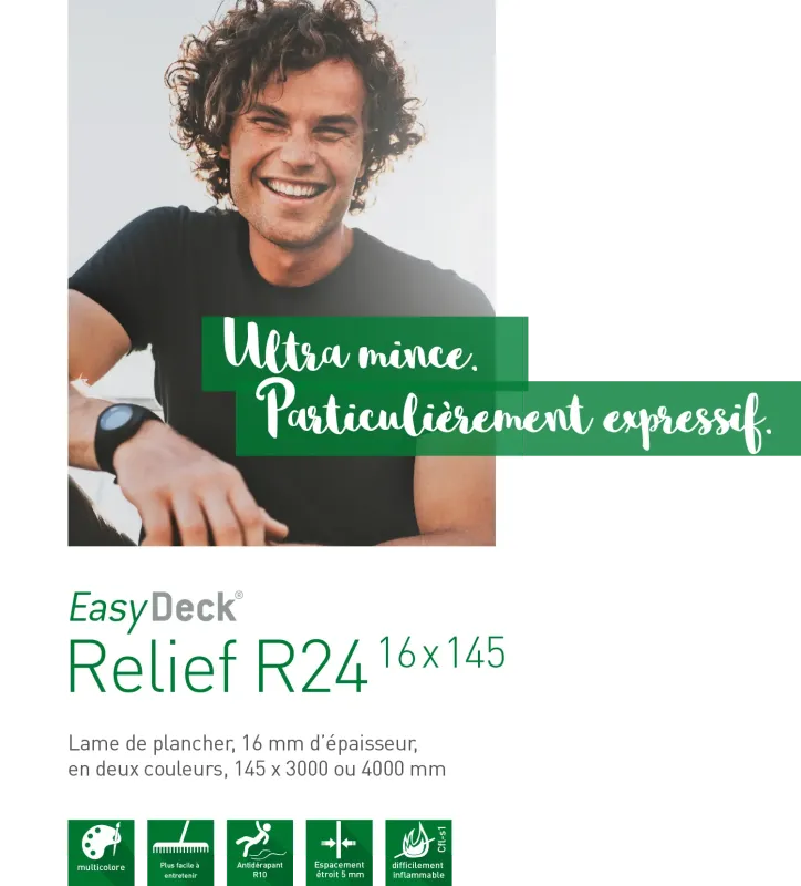 La lame de terrasse RELIEF R24 se distingue par sa surface gaufrée et mate, disponible en deux élégants dégradés de couleurs. Avec ses dimensions de 16 x 145 mm et fabriquée dans le matériau GCC HARZart, elle apporte un design moderne et une fonctionnalité à votre terrasse. Sa surface structurée lui confère un aspect harmonieux et une sensation de marche agréable. Aménagez votre terrasse avec RELIEF R24 – naturellement belle, robuste et intemporelle.