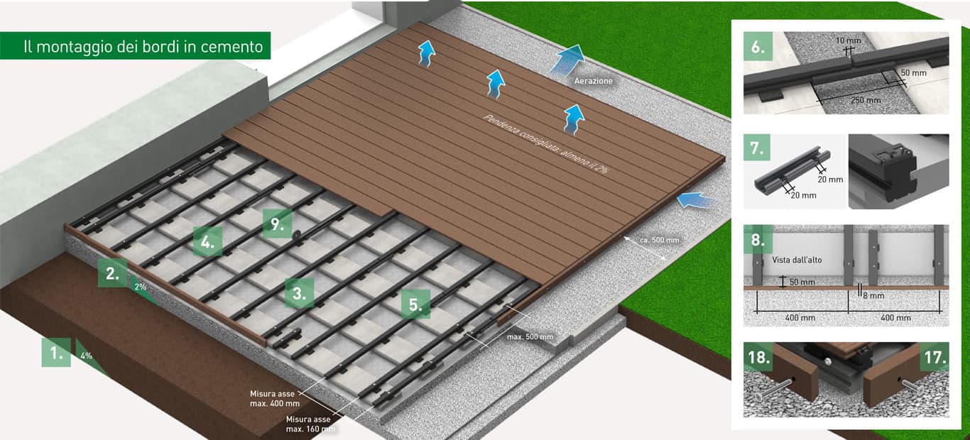 Continuare con il montaggio della sottostruttura di blocchi di bordo in cemento, punti da 4 a 9.