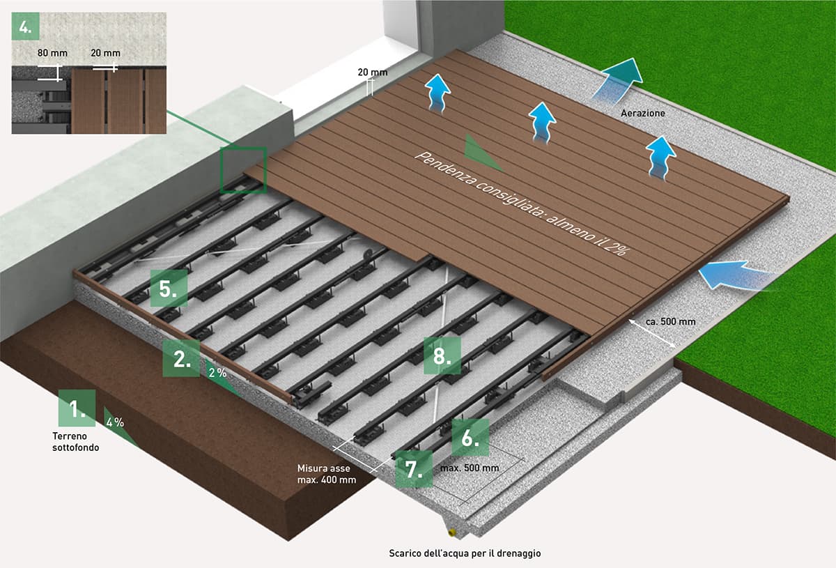 Predisporre un letto di ghiaia (drenaggio incluso) di 500 mm più grande rispetto al terrazzo con una pendenza