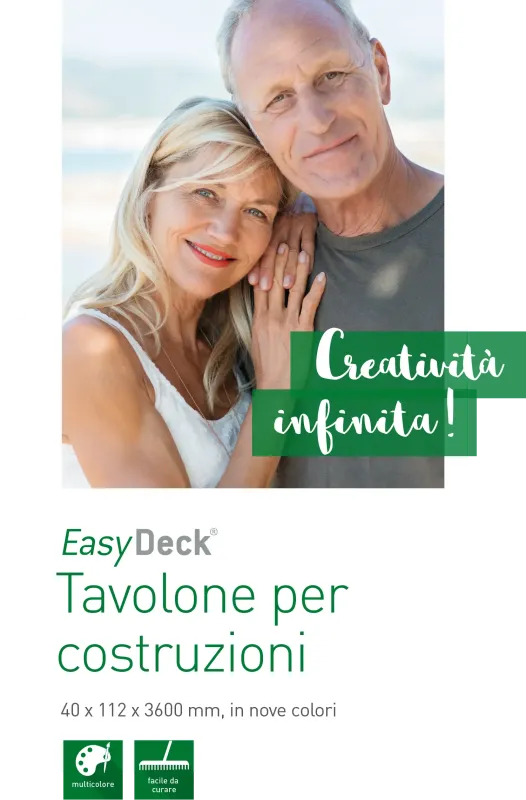 La nuova gamma di legname da costruzione EasyDeck® è pensata per soddisfare ogni tipo di idea e affascina per la sua grande flessibilità. Il profilo a rombi chiuso e le tavole da costruzione consentono di realizzare numerose soluzioni per esterni.