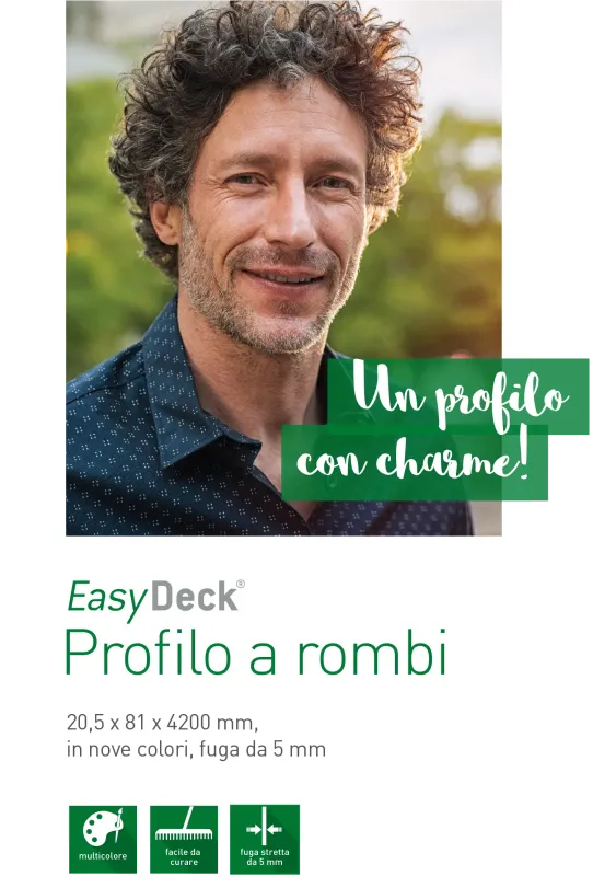 Il profilo a rombi può essere utilizzato sia come elegante elemento di rivestimento che come listello di chiusura per terrazze ed è disponibile in nove colori. I colori del profilo a rombi sono assegnati a una gamma cromatica che garantisce l'armonia con le tavole per terrazze scelte. Per scoprire quale profilo è più adatto alla tua terrazza, clicca qui.