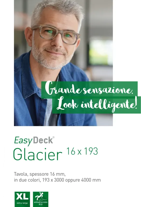 Le tavole della gamma Glacier sono caratterizzate dal mix di due lati diversi. Poiché può essere posata su entrambi i lati, la tavola Glacier 16x193 vanta una superficie finemente ondulata su un lato e una superficie con carattere legno sull'altro. Le strutture superficiali testurizzate disposte in modo casuale conferiscono alla superficie una dinamica visiva. Le tavole extra larghe sono disponibili nei colori terra e grafite e sono anche un vero e proprio richiamo visivo!