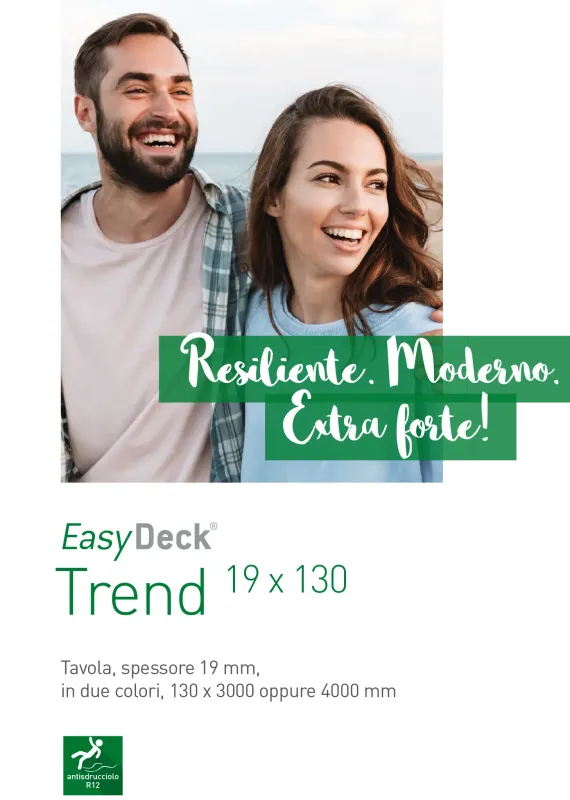 Con uno spessore di 19 mm, la nostra tavola Trend 19x130 è davvero resistente. La tavola ha due lati diversi. Un lato presenta un raffinato design ondulato, mentre l'altro è scanalato. Entrambi i lati possono essere posati in terra o grafite. Installando queste tavole al posto di quelle resistenti al colore e antiscivolo, potrete migliorare il vostro tempo libero all'aperto in modo moderno e sicuro.