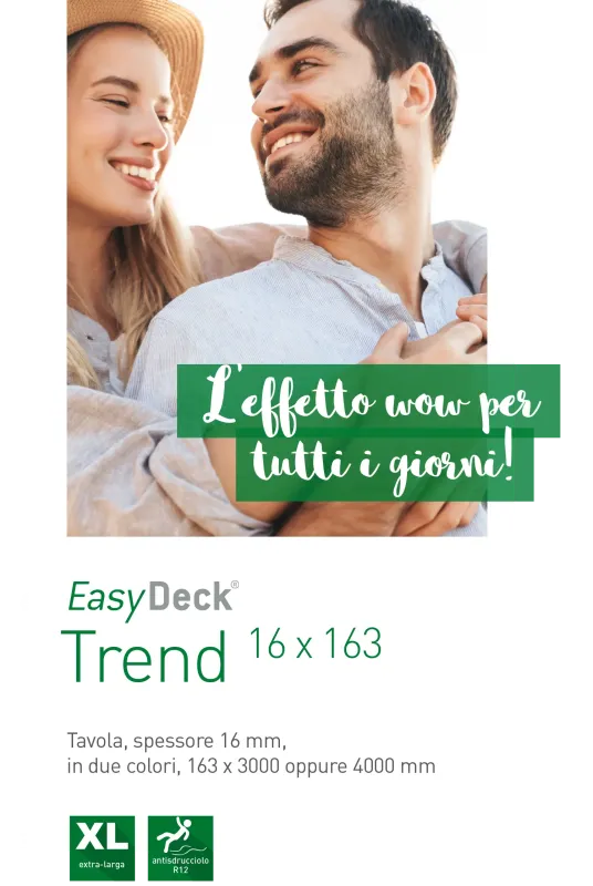 Una tavola, tante possibilità. Grazie alle sue caratteristiche moderne, la nostra ampia tavola da terrazzo Trend 16x163 è all'altezza del suo nome. Può essere posata su entrambi i lati ed è disponibile nei colori terra e grafite. Finemente ondulata su un lato e scanalata sull'altro. Qualunque sia la vostra scelta, potrete godervi a lungo la robustezza di questa superficie.