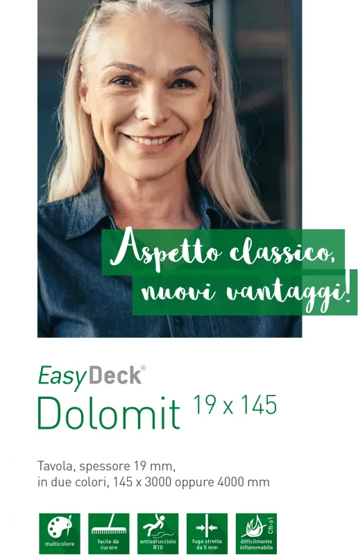 Dolomit 19 x 145: classico, pregiato e robusto. Il pannello con superficie ondulata e opaca è disponibile nei colori Marrone Focus o Grigio Fokus. Il materiale GCC HARZart utilizzato rinforza la superficie del pannello. È sigillato, più facile da pulire e ignifugo. La struttura e la sfumatura naturale del colore trasformano la vostra terrazza in una piacevole oasi ricca di comfort.