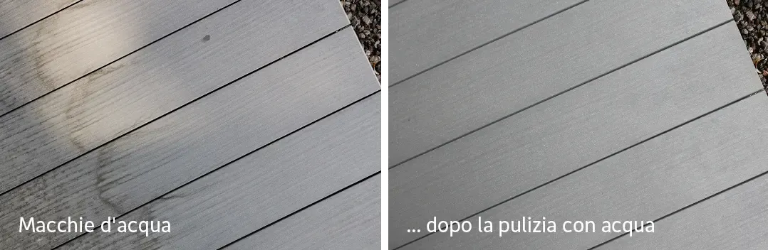 Molte macchie sbiadiscono con il tempo a causa dell'esposizione al sole e alla pioggia. Per le macchie più ostinate sulle tavole in GCC HOLZart e GCC HARZart, si consiglia di utilizzare il nostro detergente liquido speciale altamente concentrato GCC Pure Wash. Il detergente senza fosfati è a base di materie prime rinnovabili ed è completamente biodegradabile.